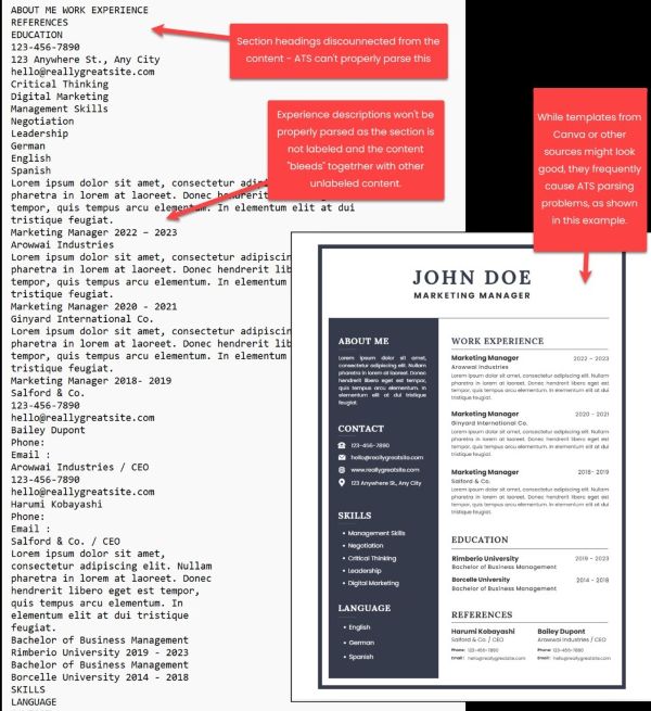 Canva resume templates often use multi-column layouts, intricate designs, or overlapping elements to look visually appealing. These can confuse ATS, which read text linearly (left to right, top to bottom). Even if the text is extractable, the jumbled output can make your resume unreadable in the ATS database.